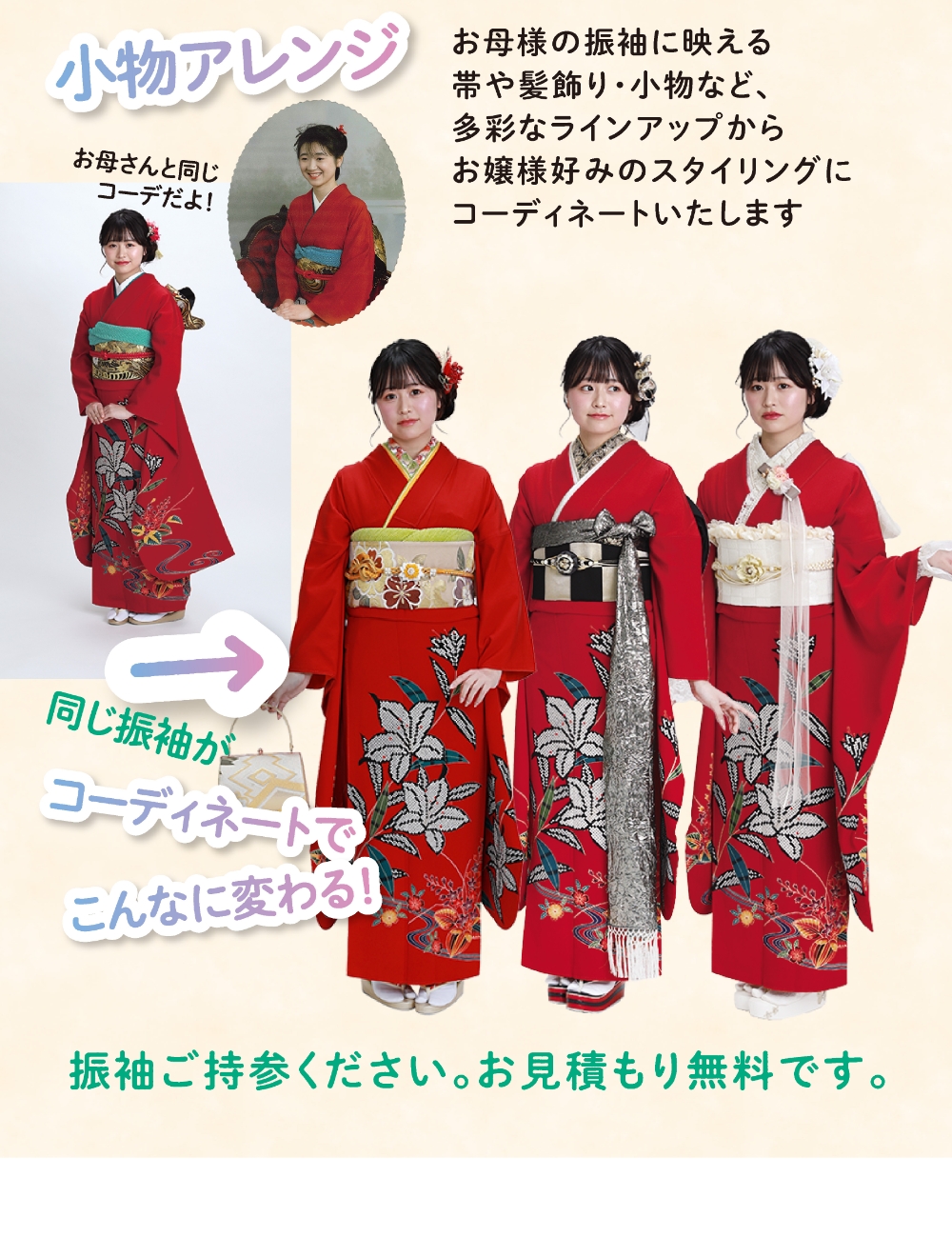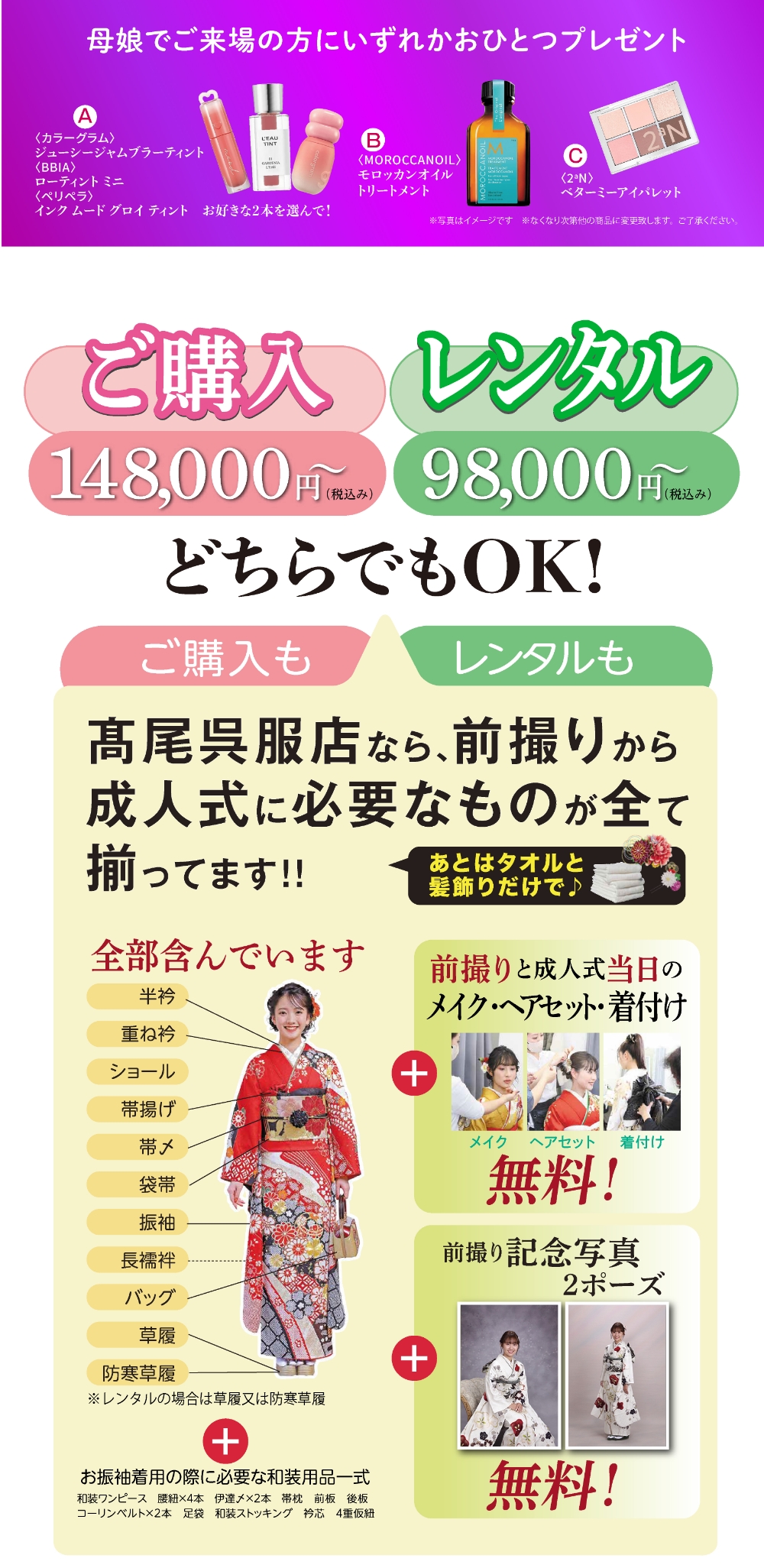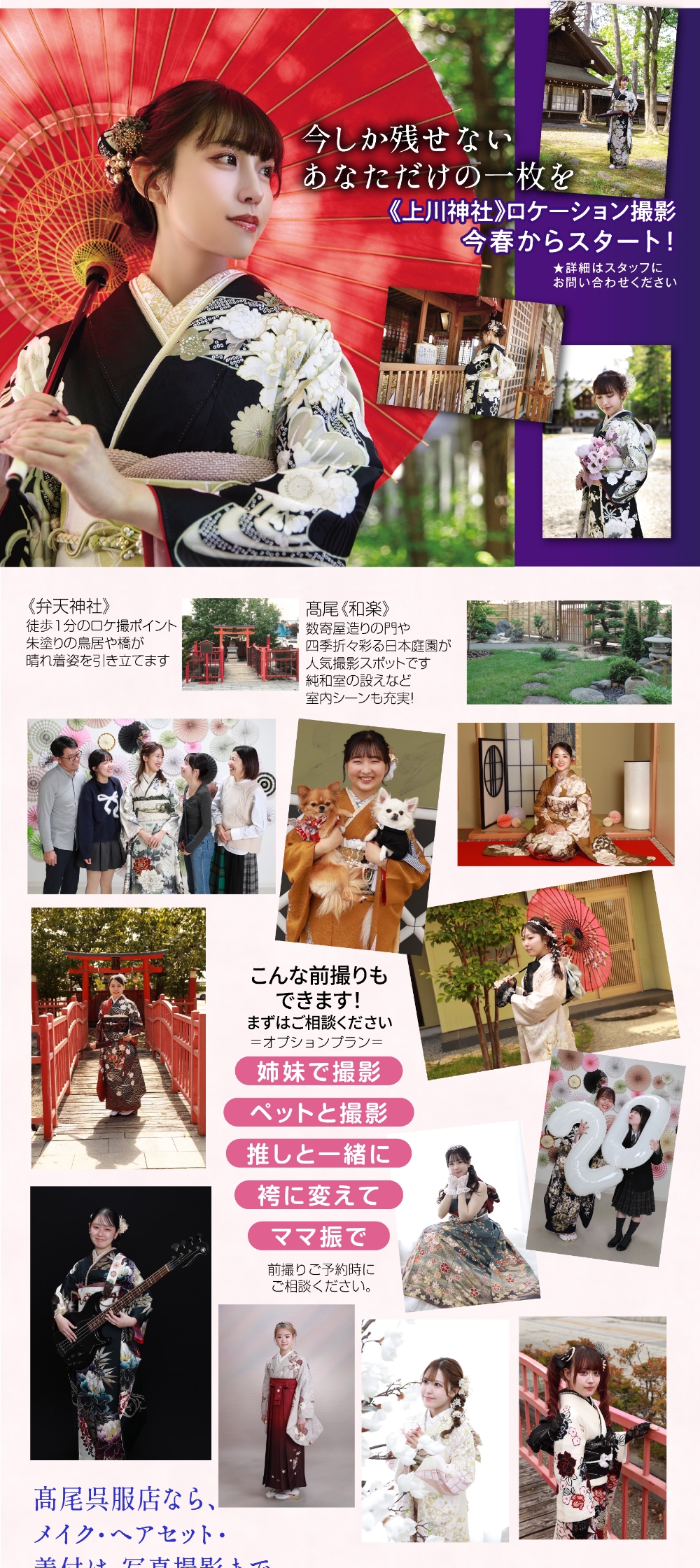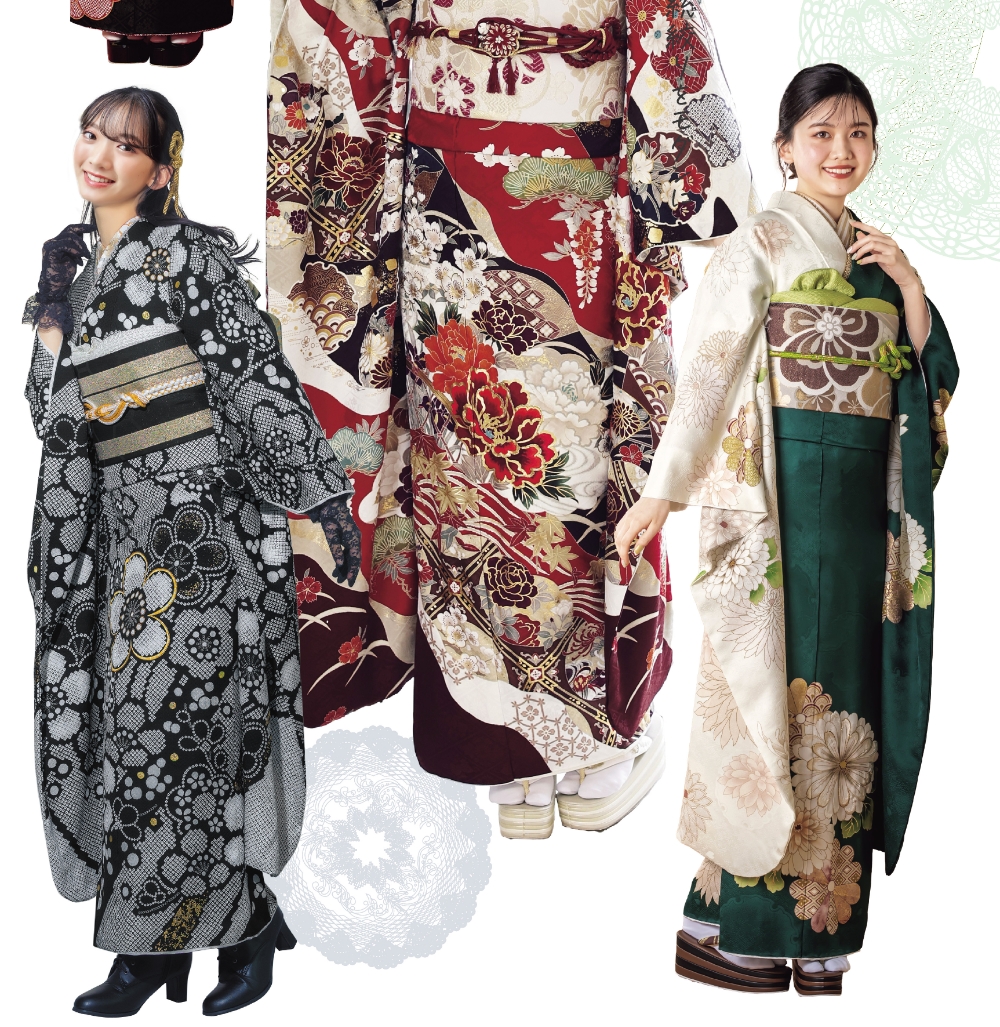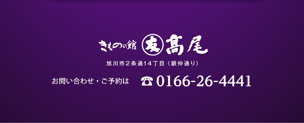 振り袖、色留袖、留め袖、訪問着、小紋、付下げ、色無地、大島、紬、コート地、袋帯、帯全般、七五三、祝い着、夏物、喪服、裏物、小物、加工、悉皆業、各種レンタル品、写真スタジオ