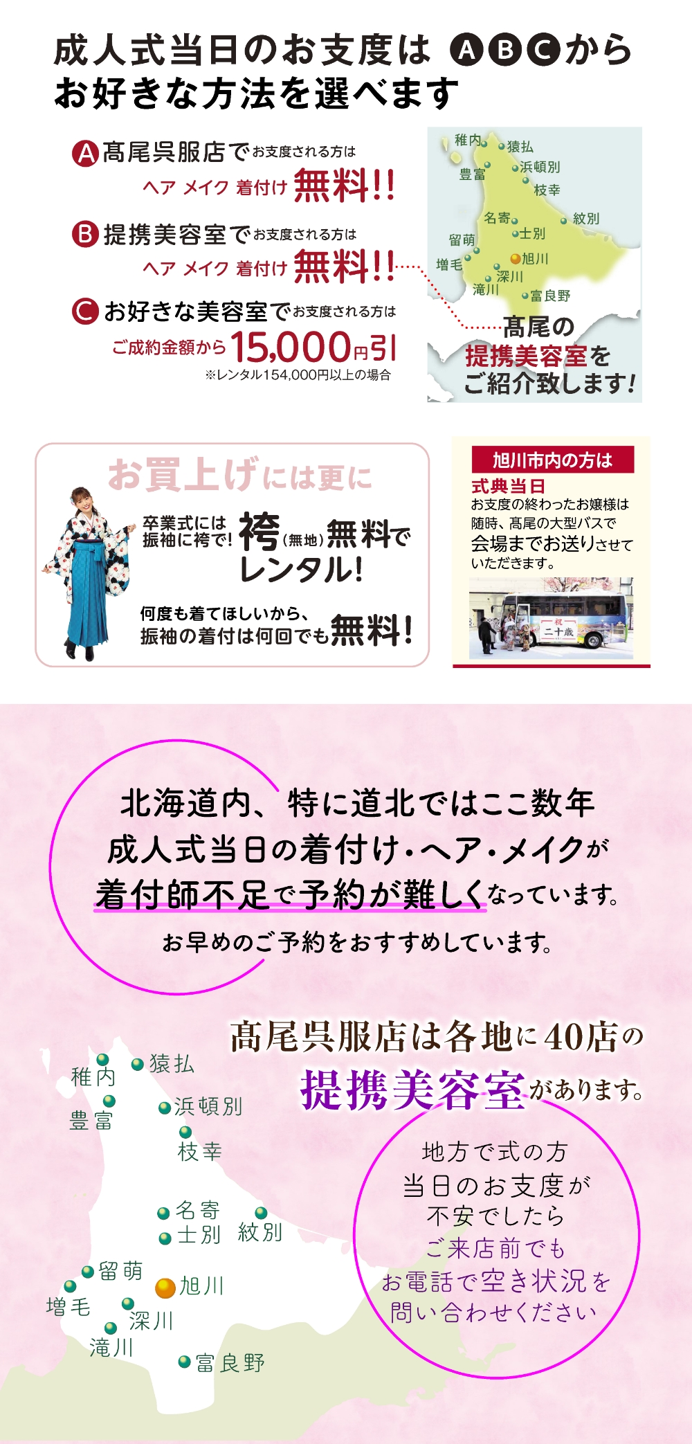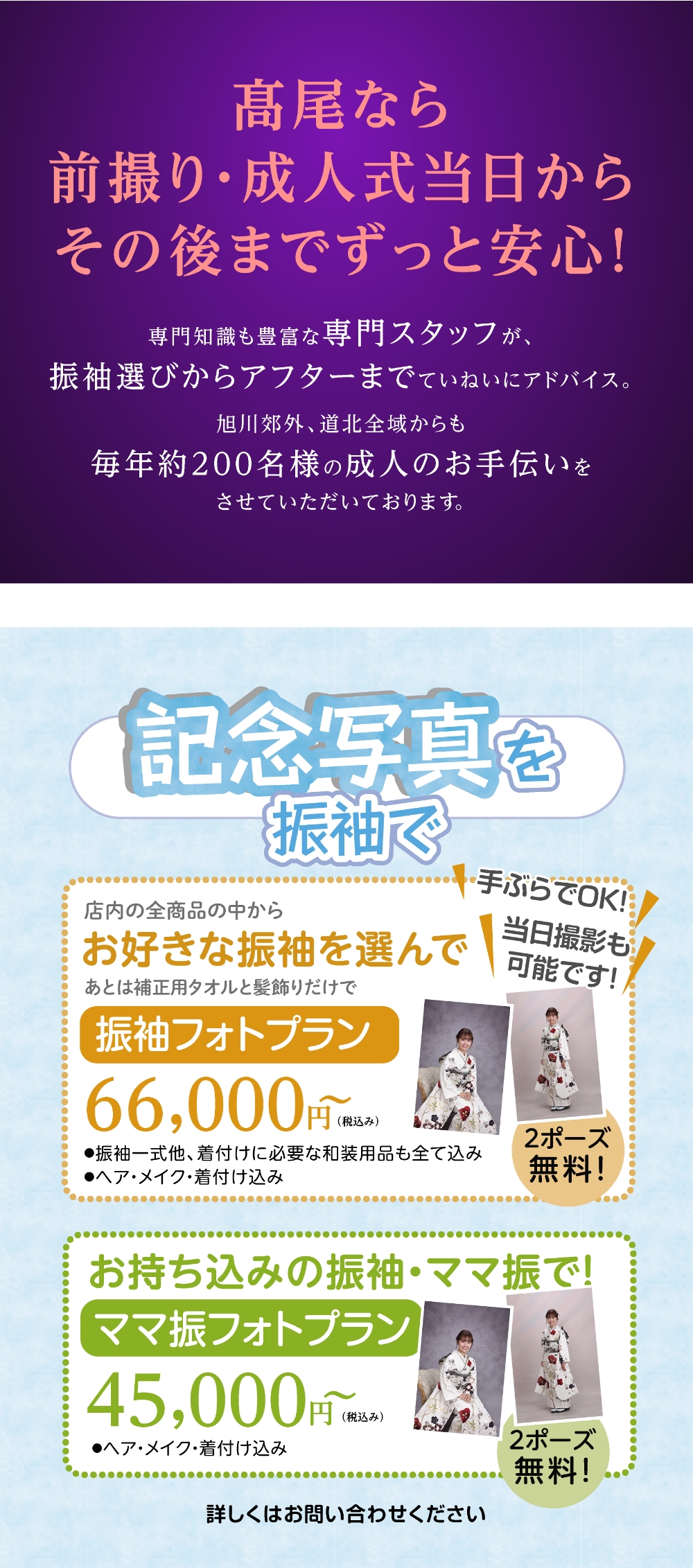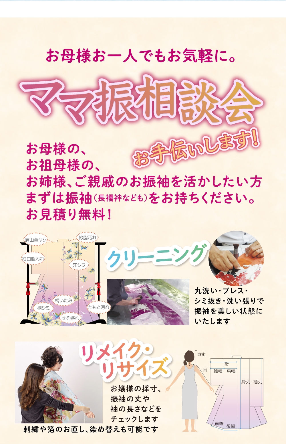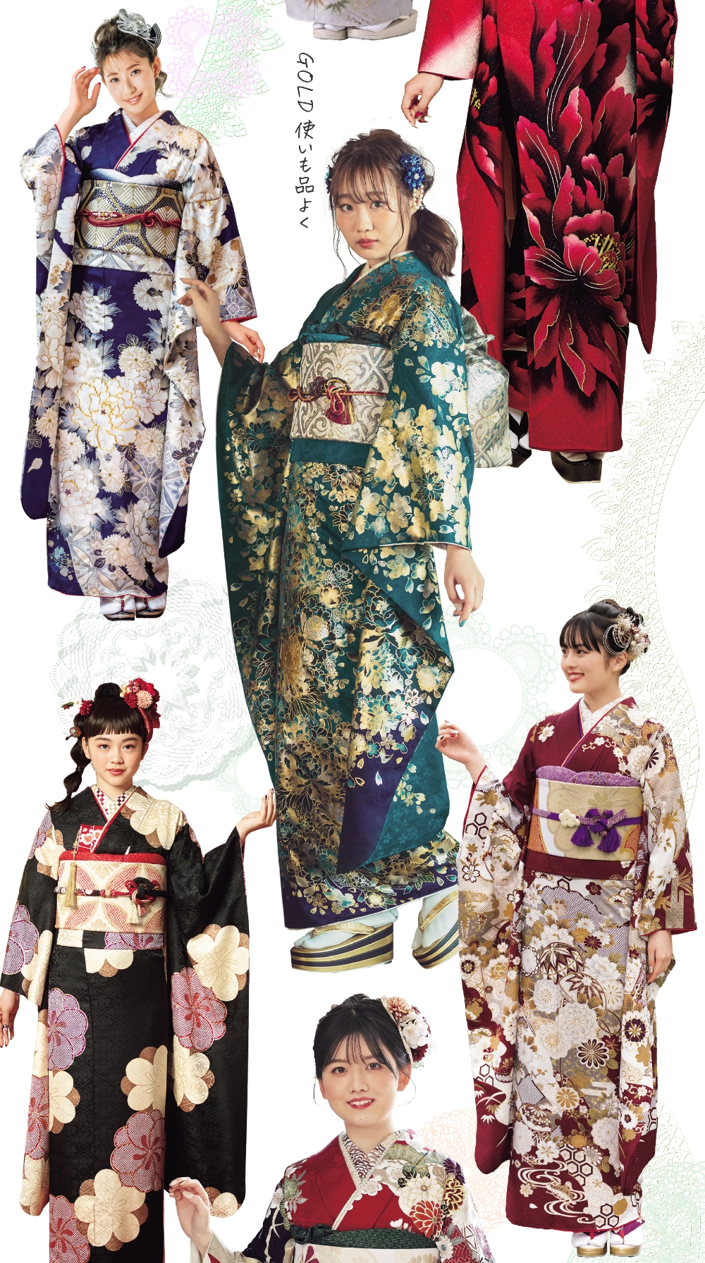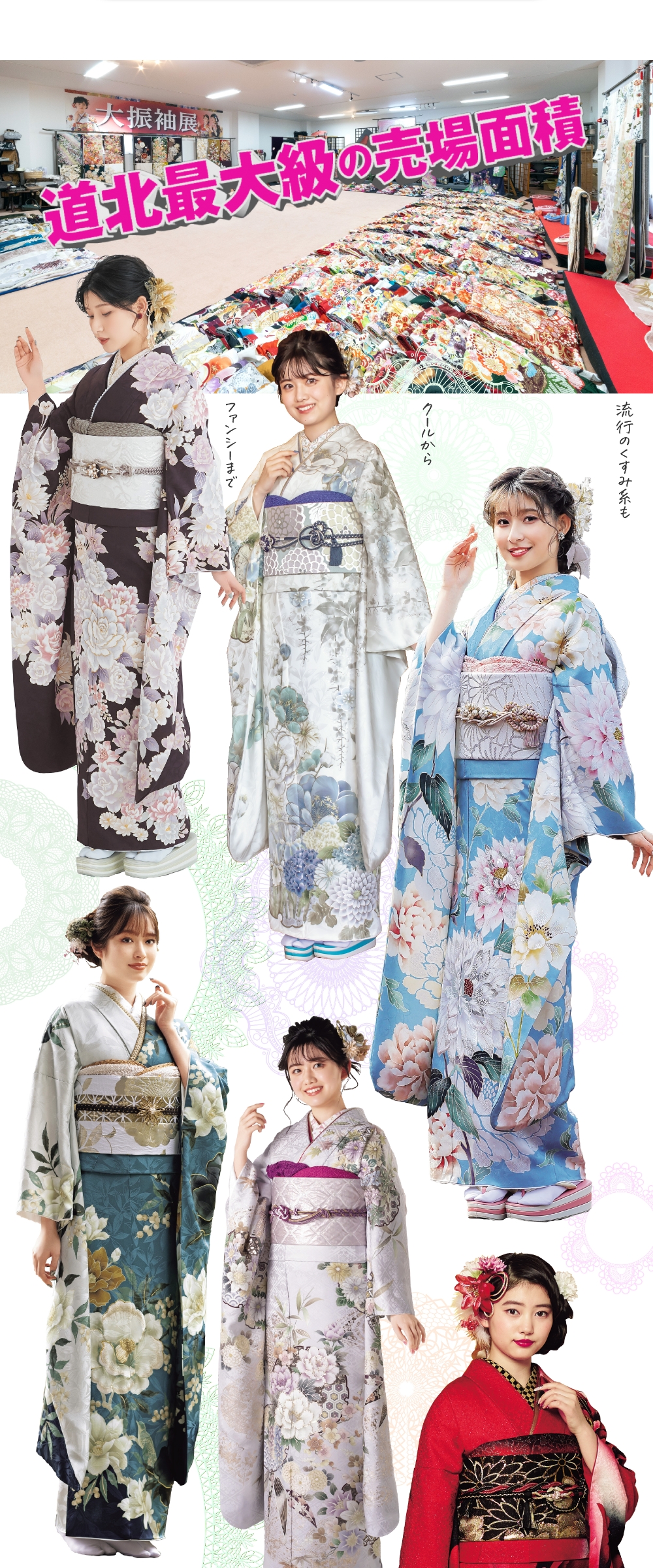 振り袖、色留袖、留め袖、訪問着、小紋、付下げ、色無地、大島、紬、コート地、袋帯、帯全般、七五三、祝い着、夏物、喪服、裏物、小物、加工、悉皆業、各種レンタル品、写真スタジオ